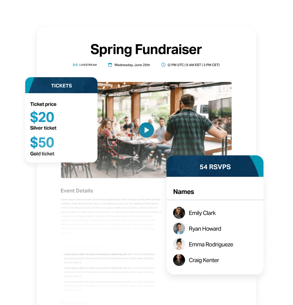 Host events with RSVPs, ticket sales, and follow-ups, all synced to your database to drive engagement and turn attendees into active supporters.