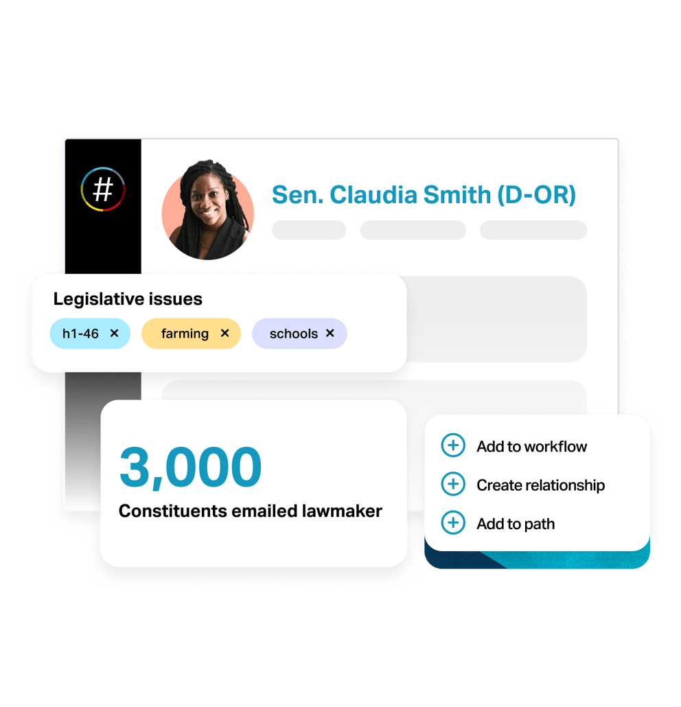 Launch advocacy campaigns fast with actions that tag supporters by issue and keep them engaged with ongoing legislative updates.