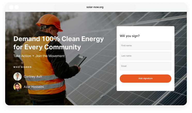 Create action-oriented pages that inspire supporters to sign petitions, contact elected officials, and share your cause.